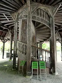 The wooden Chinese Tower is supposed to resemble a Chinese temple in the style of a pagoda.[6] The building is 25 metres tall[12] and has five floors including the ground floor.[3]: 4 Like a pine tree, the tower narrows down upwards floor by floor. Each floor is supported by wood shingles. Gold-coloured bells hang on the corners on the inside of the tower. There is a winding stairway connecting the floors in the middle of the tower. Each floor is supported by wooden beams from underneath.[5]: 46 The maximum diameter of the tower is about 19 metres, while the minimum diameter of each floor is 6 metres.[12]