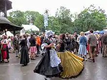 Many men and women in Tracht meet at 06:00 in the morning on the third Sunday of July for the annual Kocherlball,[15] to dance folk dances and waltzes. This event comes from a habit of cooks, maids and servers to meet at the Chinese Tower on summer Sundays before the start of their workday,[3]: 4 to dance together.[6] The ball was established in 1880 and was first attended by around 5000 people.[16] In 1904 the police forbade the Kocherlball as "unethical".[17][5]: 46 This tradition was re-established in 1989 during the 200th anniversary of the Englischer Garten, however the ball is now held on only one Sunday in the year. The first re-established Kocherlball was attended by around 15 thousand people.[3]: 4 The number of attendees shrank to around 10 thousand in the following years.[18] In 2002[16] and 2013[19] the event was attended by about 12 thousand people and the 16th re-established ball was attended by about 15 thousand people.[20] In 2014 another Kocherlball was held in Bad Tölz to celebrate the 100th anniversary of the Tölzer Kurhaus.[18]