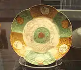 Such mixed influences are especially visible in the earthenwares of Northern China in the 6th century, such as those of the Northern Qi (550–577) or the Northern Zhou (557–581).[5][6] In that period, high quality high-fired earthenware starts to appear, called the "jeweled type", which incorporates lotuses from Buddhist art, as well as elements of Sasanian designs such as pearl roundels, lion masks or musicians and dancers.[5] The best of these ceramics use bluish green, yellow or olive glazes.[5]
