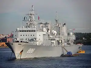 Type 903 integrated supply ship (NATO called Fuchi-class supply ship) is a new large-scale integrated supply ship of the Chinese People's Liberation Army Navy, designed by Zhang Wende. The later improved model is called 903A. The difference with 903 is that the displacement has increased from 20,530 tons to 23,000 tons.[1]