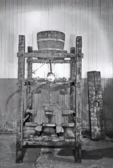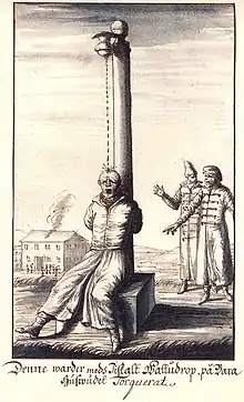 Chinese water torture or a "dripping machine"[1] is a mentally painful process in which cold water is slowly dripped onto the scalp, forehead or face for a prolonged period of time.[1] The process causes fear and mental deterioration in the subject. The pattern of the drops is often irregular, and the cold sensation jarring, which causes anxiety as a person tries to anticipate the next drip.[2] This form of torture was first described by Hippolytus De Marsiliis in Italy in the 15th or 16th century.[1][3]