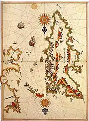 The ancient writer Pausanias tells us that the poet Ion of Chios believed the island received its name from Chios, the son of Poseidon by a nymph of the island, who was born amidst snowfall (Ancient Greek χιών chiōn "snow").[8] Known as Ophioússa (Οφιούσσα, "snake island") and Pityoussa (Πιτυούσσα, "pine-tree island") in antiquity, during the later Middle Ages the island was ruled by a number of non-Greek powers and was known as Scio (Genoese), Chio (Italian) and Sakız (صاقيز —Ottoman Turkish). The capital during that time was Kastron (Κάστρον, "castle").