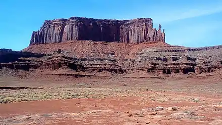 Chip and Dale Towers are two 300-foot (91-meter) tall sandstone towers located in the Island in the Sky District of Canyonlands National Park, in San Juan County, Utah. Dale Tower rises to an elevation of 5,620 feet (1,710 meters), whereas the lower Chip Tower is 5,420-feet. Airport Tower is set 2.5 mi (4.0 km) to the southwest, and Dead Horse Point State Park overlook is situated 4.5 mi (7.2 km) to the north-northeast. Chip and Dale Towers are an eroded fin composed of hard, fine-grained Wingate Sandstone, which is the remains of wind-borne sand dunes deposited approximately 200 million years ago in the Late Triassic. This Wingate Sandstone overlays a softer layer of the Chinle Formation. Access to the towers is via the four-wheel drive White Rim Road, and a scramble to reach the base.[3] The top of the towers rise over 1,000 feet above the road in approximately one-half mile. Precipitation runoff from Chip and Dale Towers drains east to the nearby Colorado River.