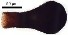Chitinozoa range in length from around 50 to 2000 micrometres.[3] They appear dark to almost opaque when viewed under an optical microscope. External ornamentation is often preserved on the surface of the fossils, in the form of hairs, loops or protrusions, which are sometimes as large as the chamber itself. The range and complexity of ornament increased with time, against a backdrop of decreasing organism size. The earliest Ordovician species were large and smooth-walled;[1] by the mid-Ordovician a large and expanding variety of ornament, and of hollow appendages, was evident. While shorter appendages are generally solid, larger protrusions tend to be hollow, with some of the largest displaying a spongy internal structure.[6] However, even hollow appendages leave no mark on the inner wall of the organisms: this may suggest that they were secreted or attached from the outside.[6] There is some debate about the number of layers present in the organisms' walls: up to three layers have been reported, with the internal wall often ornamented; some specimens only appear to display one such wall layer. The multitude of walls may indeed reflect the construction of the organism, but could be a result of the preservational process.[6]