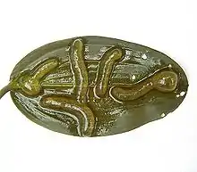 Whilst little is known about their interactions with other organisms, small holes in the tests of some chitinozoans are evidence that they were hosts to some parasites.[6][12][13] Although some forms have been reinterpreted as "pock-marks" caused by the disintegration of the diagenetic mineral pyrite,[14] the clustering of cylindrical holes around the chamber — where the flesh of the organism was likely to be concentrated — is evidence for a biological cause.[6]