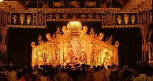 The first wave of Bengali settlers came to a Delhi in the late 1700s and early 1800s. Another essential requirement was that of a Kali Bari. The first Kali Bari of Delhi is the one at Tis Hazari, which still exists. The idol and Kali Bari were first established in 1826 but the temple was destroyed during the 1857 revolt. The idol was later salvaged and a temple built in Roshanpura. Space started to fall short to accommodate the devotees, the land was bought and the present temple built at Tis Hazari in 1917. There are more than 25 Kali bari temple and few Durga bari. Moreover, few other temples of Bengali faith are also built in different parts of New Delhi and NCR. The first private Durga Puja in Delhi was celebrated in 1842 by one Majumdar of Rajshahi, followed by some other Puja celebrations that continued for a few years. The first baroyari (community-based) Puja is that of Kashmiri Gate, first started in 1910 and still celebrated with the same fervour and traditions. Kali Bari in Mandir Marg temple built-in 1930. The Big wave of Bengali settled when Calcutta and Delhi were first connected by train in 1864, thereafter with the shifting of capital to New Delhi in 1911, the shifting to government employees' followed logically. The Next big wave settled in 1947 and 1971. Initially employees from central government departments like Post and Telegraph, Government of India Press, Accountant General of Central Revenues (AGCR) and Railways were settled in Timarpur; thereafter in 1924, another phase of government housing came up near Gole Market, for employees of the Secretariat. Over time, many employees, after retirement, settled in Karol Bagh and WEA, and later in South Delhi.[6]
