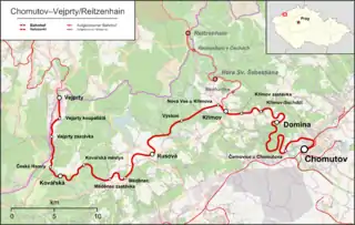 The Chomutov–Reitzenhain railway and its branch to Vejprty is a branch line (Czech: regionální dráha)[1] in the Czech Republic, that was originally built and operated by the Buschtěhrad Railway Company (BEB). It begins in Chomutov (Komotau), crosses the Ore Mountains, and ends today in the border station of Vejprty (Weipert), where there is a connexion to the German railway network over the Vejprty–Annaberg-Buchholz railway. The branch from Křimov to Reitzenhain has been closed since 1972.