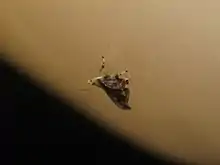 The wingspan is about 5 mm. Adults have forewings with a complex pattern of orange, brown, white and grey. The hindwings are a plain brown.