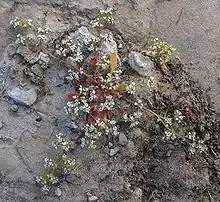 - Chorizanthe parryi var. fernandina — San Fernando Valley spineflower, endemic to Southern California and formerly known in 10 locations in the foothills around the San Fernando Valley and ranges in Los Angeles, Orange, and Ventura counties. Those were lost to development, and botanists thought the species was extinct from 1929 until it was discovered in 1999. It is now only known from 2 populations: on Laskey Mesa in Upper Las Virgenes Canyon Open Space Preserve of the Simi Hills in Ventura County; and on the proposed Newhall Ranch mega−development site in the Santa Clara River Valley at the base of the northern Santa Susana Mountains in Los Angeles County.[2][3][4] It is a state California Department of Fish and Wildlife and California Native Plant Society listed Critically endangered species.[5][6]