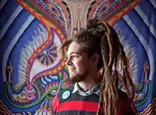 Chris Dyer (born March 3, 1979) is a Peruvian–Canadian artist based in Montreal, who exhibits, performs and teaches his art worldwide. Some of his broader artistic themes include consciousness, truth, oneness, introspection, personal development and kindness.[1] He paints using acrylic, pencil, pen, spray paint, gouache and other media on a variety of different forms, including broken or blank skateboards in his early years, various sculptured and recycled items, and now commonly fabric or wood canvas. He is also known for his murals, logos, album covers, posters, illustrations, comic books, travel diaries (The Sunlight Chronicles),[2] and YouTube adventure vlogs (Artventures).[3] He was the art director and brand manager of Creation Skateboards/Satori Movement[4] for three and a half years, creating designs for hundreds of skateboard decks. He teaches many art workshops and classes on technique, spray painting, traditional medicinal healing,[5] and the business of art, as well as offering an online class.[6] He has created his own brand of conscious clothing and other goods, Positive Creations, which features some of his most well-loved art.[7] Though his styles, mediums and subject matters are always in flow, the main theme seen through his artwork is cultural and spiritual oneness of humanity and beyond.