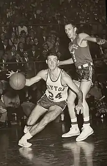 When Harris was 18, he received a basketball scholarship to the University of Dayton, where he became a teammate of Jim Paxson, Sr., father of future NBA players Jim and John. Due to the Korean War, freshmen were allowed to play on varsity teams in 1951, so Harris participated on a powerful Flyers team led by All-American Don Meineke, who would go on to become the NBA's first Rookie of the Year the following year. That Dayton squad went 28-5 in 1951-52 and advanced to the final game of the National Invitational Tournament at Madison Square Garden in New York City, considered at that time the national championship of college basketball. Dayton would lose to La Salle 75-64 on March 15, 1952. The Flyers had a disappointing 1952-53 season, finishing 16-13 and not advancing to the NIT. However, in the second-to-last game of that year, on March 1, 1953, Harris played every minute in Dayton's 71-65 victory over number-one ranked Seton Hall University, scoring the game's final point on a free throw. The loss was the first for Seton Hall in 28 games.[2] The Flyers rebounded with a 25-7 record in 1953-54, led by Harris, All-America forward John Horan, seven-foot All-America center Bill Uhl, forward Jack Sallee and guard Don Donoher, who would later become University of Dayton head basketball coach from 1964-1989, assistant coach on the 1984 Gold Medal-winning men's basketball team at the Los Angeles Olympic Games, and a 2015 inductee into the National Collegiate Basketball Hall of Fame. Dayton would advance to the NIT Quarterfinals that year, losing to Niagara 77-74 on March 8, 1954.