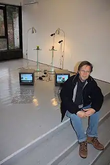 ![]() Chris Meigh-Andrews in front of his work Turing Test during his exhibition Sculpting with Light & Time: Video and Installations 1978-2014 at The Minories Galleries. | |