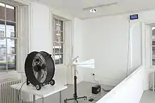 Many of the artist's more recent works have featured renewable energy sources intended to power the works and interact with the gallery space.[7] 1994's Perpetual Motion featured a video monitor powered by a wind turbine, with the wind being supplied by a fan plugged into the gallery's power.[8] Mothlight (1998) and Mothlight II (2001) featured solar-powered video screens powered by halogen lights.[5] His 2002 installation 2002, For William Henry Fox Talbot (The Pencil of Nature) consisted of a solar-powered video camera at Lacock Abbey, reproducing a live image of William Henry Fox Talbot's 1835 photograph of a latticed window at the abbey (the world's oldest surviving photograph), then transmitted to the Victoria and Albert Museum in London.[9] 2004's Interwoven Motion was an outdoor video installation in Grizedale Forest, Cumbria, made up of a wind- and solar-powered camera and screen, it produced video images displayed on a weatherproof LCD display.[10] 2005's Resurrection featured a series of solar panels mounted on a dead tree, powering a video display of the tree in its living form.[11] And his 2011 installation Sunbeam used solar panels to power the projection of images of the sun from NASA’ s Solar Dynamics Observatory.[12]
