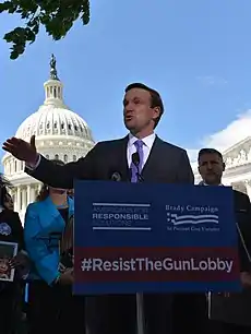 The Sandy Hook Elementary School shooting occurred in Newtown, Connecticut, within Murphy's House district near the end of his term. In the aftermath of the shooting, he became a leading voice in the movement to prevent gun violence, supporting numerous policies including universal background checks and ending the ban on gun violence research at the CDC.[78] Murphy supported the bipartisan Manchin-Toomey background checks proposal, which would have strengthened and expanded the existing background check system and established a National Commission on Mass Violence to study in-depth all the causes of mass violence.[79]