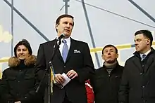 Murphy defeated former Connecticut Secretary of State Susan Bysiewicz in the Democratic primary and defeated Republican candidate Linda McMahon in the general election.[50][51] After McMahon's negative ads left Murphy "on the defensive virtually nonstop" and struggling to respond, the Democratic Senatorial Campaign Committee sent additional staff and money to Murphy to help with his campaign, saying they are "100 percent behind [him]."[52] Among the issues raised was Chase Home Finance sued for foreclosure against Murphy, whose campaign initially responded by claiming that Murphy had missed "a couple of mortgage payments." Murphy claimed that he did not know he was in default until legal proceedings started. Murphy received a loan at the rate of 4.99% from Webster Bank in 2008 to consolidate his previous mortgages.[53] At the time of this loan, Murphy was serving on the House Financial Services Committee. Murphy's opponent McMahon accused him of receiving what she called "special interest loans," and called on Murphy to release his financial records. Bank officials and outside experts claim there was nothing improper about the loans made to Murphy.[53][54][55]