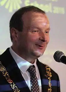 Chris O'Leary is an Irish Sinn Féin politician. He was formerly a Cork City Councillor and Lord Mayor of Cork.[2] With a background in community development projects, in 2002 he was co-opted into the council to replace his Green Party colleague Dan Boyle who had been elected a TD.[3] O'Leary left the Green Party in 2009,[4] and was an independent councillor prior to joining Sinn Féin in 2010.[5] He became Lord Mayor of Cork in June 2015,[6] in the second year of a D'Hondt method rotation agreed for the office in 2014.[7][8][9] He was Lord Mayor of Cork from June 2015 to June 2016, when he was replaced by Fine Gael politician Des Cahill.[10] In the 2019 Irish local elections, O'Leary was not reelected, one of two Sinn Féin councillors to lose seats on Cork City Council.[11]