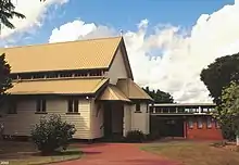 Christ Church, Childers is a timber building located on Macrossan Street, a secondary street running parallel to the main street of the town of Childers. Views of the church are gained from McIllwraith Street as it slopes away towards the cane fields which provide a backdrop to the church. The church is set back from the street and is accessed via a wide red concrete driveway. It is low-set on brick piers and is clad in painted weatherboards of a creamy colour. The roof is steeply pitched and finished in "trimdeck", wide-pan steel roof sheeting in a dull brown colour-bonded finish. The gable ends are surmounted by small timber crosses.[1]