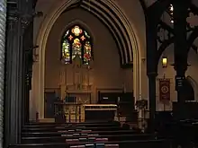 When completed in 1869, the church's interior could accommodate 400 parishioners, and featured a tint-glass chancel window by Fredericks of Brooklyn.[26] Today, the interior is adorned with a Tiffany-style window above the altar, dedicated in 1919, and several pictorial stained-glass windows (dedicated in 1968) around the nave featuring scenes associated with the life of Jesus of Nazareth. The nave windows are the works of the United States' oldest continuously-run decorative arts firm, J & R. Lamb Studios, and include work designed by stained-glass artist Heinrich Jan Van de Burgh.[27] They including depictions of:[12]: 70