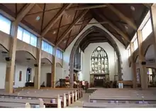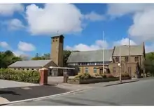 The authors of the Buildings of England series comment that the church and parish rooms have "a mishmash of an exterior".[3] The church is constructed in yellow sandstone with red sandstone dressings. The architectural style is Free Perpendicular. Standing to the southwest of the church are single-storey parish rooms, from which rises a tower with an open bell stage and a saddleback roof. Inside the church is stained glass installed in 1974 and designed by the artist Brian Clarke.[3]