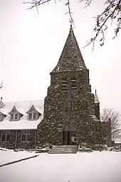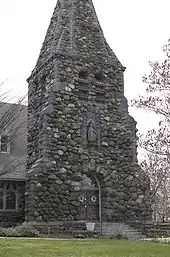 Christ Church was designed by Peabody and Stearns, masters of American Shingle style architecture,[8] and was constructed of native Waltham fieldstone in the English Country style.[9] The inspiration for the church's stone exterior came indirectly from architect H. H. Richardson, who was also a friend and Harvard classmate of Robert Treat Paine, Jr. When Paine remodeled and expanded his Waltham home in 1883, it was Richardson who designed the residence that would become Stonehurst, a Shingle style mansion built of glacial stones quarried on site from Paine's estate.[6] Richardson died in 1886 and played no part in the planning of Christ Church, but it was his Stonehurst design that inspired Robert Treat Paine, Jr. to use the same stones from his property for the exterior of the church.[7]
