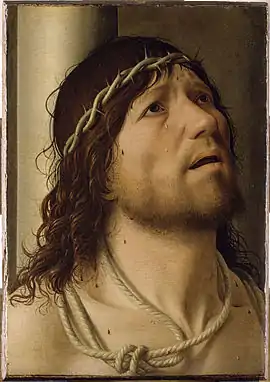 The face of Christ was a common theme in Antonello's art: however, portraying Christ in the middle of his pain, in the moment in which the tortures have just begun, Antonello managed to obtain an emotive impact sometimes lacking in his similar works.