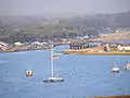 There were numerous Harbour Improvement schemes proposed in the next three centuries, particularly the Railway and Docks Scheme of 1885. This would have seen major dredging of the harbour, training banks within the harbour and a railway terminus on the south side.[11] In 1965 there were a plans to construct a marina at Wick Hams.[12] This and the other schemes were never proceeded with. In the 1930s there were three "tea boats" providing refreshments to holidaymakers and at least another five houseboats in the harbour these were all abandoned and then wrecked during World War II.[13] The River was dredged in 1937 and again in the 1950s using a Suction Dredger, in the late 1980s Wessex Water carried out substantial dredging in the River Stour from Iford bridge as far as Christchurch Quay, this was part of a Flood Alleviation Plan.[14] The channel has been marked since at least 1884 first by Christchurch Sailing Club and since 1963 by the Harbour Improvements Association now renamed Christchurch Harbour Association.[14] Since 1963 the Mudeford inshore lifeboat has been stationed on the quay at Mudeford.