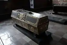 Christian gained a reputation as lazy and as a drinker.[4] He was heavily indebted; despite his father's attempts to pay some of Christian's debts, he still owed more than 215,000 rigsdaler in 1647. Among others, he took a loan from the Duke of Gottorp in 1646 in order to finance a stay in a Bohemian spa. He left Nykøbing for Bohemia on 8 May 1647. He reached Dresden on 28 May, and continued on 1 June. Not long after leaving he was struck by a fit of illness. He was brought to a castle in Gorbitz near Dresden, where he died on the next day. He was buried on 8 November 1647 in the Church of Our Lady in Copenhagen. In 1655, his remains were moved to the tombs at Roskilde Cathedral.[1]