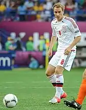 Born in Middelfart, Denmark, Eriksen followed in the footsteps of his father Thomas when he started playing football in the academy of local side, Middelfart G&BK.[4] Eriksen's father was also one of the coaches at the time and in 2004 they helped the youth side finish unbeaten in the local youth championship for the third time in a period of four years.[4] The following year, he joined Odense Boldklub who competed in the Danish youth championships and within a year had helped the club to an age-group title. It was at OB that Eriksen first began showing signs of his technical ability, with his dribbling and free-kick techniques lauded by then-coach, Tonny Hermansen.[4] His form at youth level attracted the attention of a number of major European clubs, including the likes of Chelsea and Barcelona.[5] Eriksen ultimately underwent trials with both clubs as well as Real Madrid, Manchester United and Milan, but finally decided to move to Ajax, stating, "My first step should not be too big. I knew that playing in the Netherlands would be very good for my development. Then Ajax arrived and that was a fantastic option."[6]