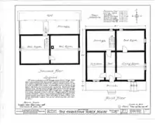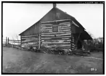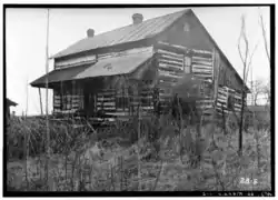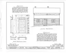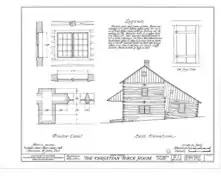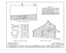In the late 1830s Christian Turck walked into a swamp near his home a mile south of Kirchhayn in Washington County and began to cut cedar logs to build a house. He squared them and laid them horizontally on top of each other, notching the corners to hold them together. A summer beam runs down the center of the house at each level, with other beams connected to it by mortise and tenon joints. Perrin points out that in this eastern German Blockbau style, the logs aren't fitted as tightly as in most Norwegian log construction, since the logs would shrink anyway, and chinking would be needed. This house was chinked with clay, rye straw, and lime plaster.[5][6] The resulting log cabin was large - two stories plus attic. Across the front (sunny south) Christian built a full-width porch sheltered by a cantilevered shed roof. On the back the roof extends down to a one-story level, adding a couple rooms and giving the building a saltbox profile.[7] Near his house, Christian laid up a brick structure which served as a smoke house, bake oven and summer kitchen.[5]