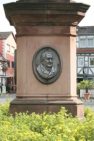 Kehrer maintained his connections to Erbach and its ruling house throughout his life, though he fell out favour in 1820, when he pointed out to the Graf that the Roman legionary eagle found near Würzberg was a blatant fake.[2] The Graf had erected a memorial called the Adlerstein of Würzberg at the supposed site of its discovery. Representations by Charlotte, the eldest daughter of the Graf, encouraged Kehrer to not abandon the ruling house, and he was eventually restored to favour after the death of the old Graf in 1823. His continued favour is amply demonstrated by the monument in the market square of Erbach which was dedicated to the Graf in 1874. On its base are three medallions, commemorating the forestry commissioner, Friedrich Louis (south side), the politician, Johann Friedrich Knapp (east side), and Christian Wilhelm Karl Kehrer (north side).