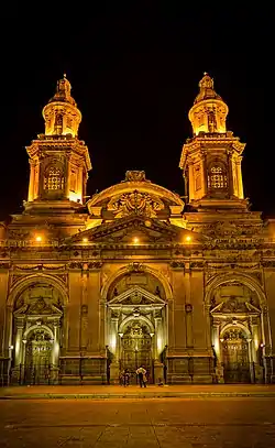 Missionary work in Chile began in earnest in 1956, when the country was made part of the Argentine mission and the first small branch was formed.[21] By 1961, the country had 1,100 members and the Chilean mission was organized. The following three decades saw explosive growth in church membership, with the church membership doubling every two years at its peak.[18] The growth sparked a building boom during these decades. Hundreds of LDS chapels were constructed, capped by the dedication of the Santiago Temple in 1983. Church growth continued in the 1990s, with the country having the greatest growth in LDS membership in South America during the decade. Between 1994 and 1996, 26 new stakes were dedicated in the country.[21] A second temple, in Concepción, was announced in 2009. The Antofagasta Chile Temple, Chile's third temple, was announced on April 7, 2019, by President Russell M. Nelson in his concluding remarks at the Sunday Afternoon Session of General Conference.[22]