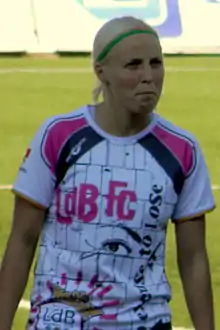 Swedish Damallsvenskan club LdB FC Malmö signed Ørntoft during their 2008 season, after an injury to regular centre back Malin Levenstad.[2] After playing with Skovlunde and, briefly, Brøndby in her homeland, Ørntoft had already acquired the nickname "Carlos" after Brazilian footballer Roberto Carlos. She would commute to Malmö from Copenhagen, where she had an apartment, boyfriend and was studying at University of Copenhagen.[3] After four years at LdB FC Malmö – disrupted by the injuries – she returned to Brøndby IF in December 2012. In December 2013 she announced a break from football and moved into a youth coaching role with Brøndby due to her pregnancy.[4]