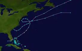 Deemed a "hybrid storm", the cyclone rapidly intensified in warm waters of up to 80 °F (27 °C) from the Gulf Stream combined with a cold air mass over the United States.[3] The system continued to rapidly intensify while moving within the Gulf Stream; it developed central convection, an unusual trait for an extratropical cyclone, and at one point exhibited an eye.[1] Despite these indications of tropical characteristics, it never was identified as tropical. On December 23 and 24, the nor'easter intensified to attain a barometric pressure of 970 mb (29 inHg).[2] An upper-level low pressure system that developed behind the storm began to intensify and grew to be larger in size than the original disturbance. In an interaction known as the Fujiwhara effect, the broad circulation of the secondary low swung the primary nor'easter northwestward towards southern New York and New England.[3] The original low passed along the south shore of Long Island, and made landfall near New York City on December 24.[4] Subsequently, it moved over southeastern New York State.[5] On December 25, the system began to rapidly weaken as it moved towards Nova Scotia, before the pair of low pressure systems moved out to sea in tandem in the early hours of December 26.[1]