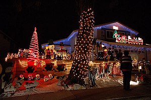 Displays range from Mickey Mouse representing the noted "Christmas Carol" story, to testing out the new naughty-or-nice software. Some displays are so elaborate that residents keep parts up all year.[6][7] School and scouting organizations often sell baked goods and hot chocolate, and members of the local school bands play Christmas carols, while other organizations rent horse-drawn carriages, double decker buses, or limousines: groups sing carols while driving around the neighborhood.[5]