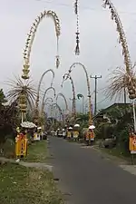 Most of Christian villages in Bali are located on the south of this island. In those villages, road decorations called penjor (made from yellow coconut leaves) will be made for Christmas, which symbolises Anantaboga dragon. The Christmas celebration is affected by Hinduism – Balinese culture.[8]