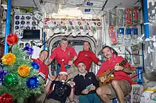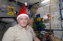 Expedition 1 arrived on the ISS on 2 November 2000, celebrating their first Christmas on board the station later that year.[2] Other celebrations included Expedition 30, with the arrival of Donald Pettit, Oleg Kononenko, and André Kuipers.[3][4] The station has been continuously occupied since 2000, so every Christmas has been experienced by a crew.[5] The holiday is popular enough that one of the traditions that has developed is having a Christmas dinner.[5]