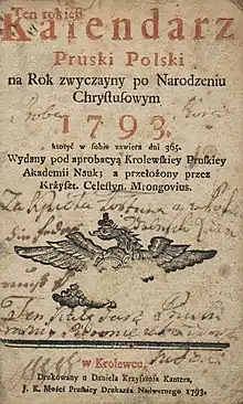 Krzysztof Celestyn Mrongovius (German: Christoph Cölestin Mrongovius; Polish: Krzysztof Celestyn Mrongowiusz) (July 19, 1764 – June 3, 1855) was a Protestant pastor, writer, philosopher, distinguished linguist, and translator. Mrongovius was a noted defender of the Polish language in Warmia and Mazury.