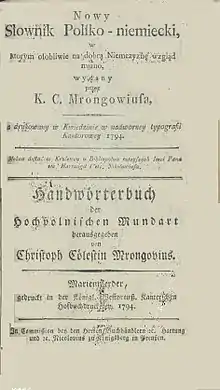 - 1794 Marienwerder Königl. Westpreuß. Kanterschen Hofbuchdruckerey. Christoph Coelestin Mrongovius Handwörterbuch der Hochpolnischen Mundart — Nowy Slownik Polsko-niemiecki.