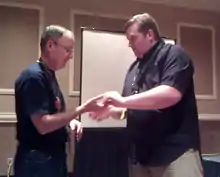![]() General Keith Alexander offers Chris Hadnagy the NSA Director’s Challenge Coin at DEF CON 20. | |