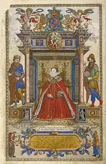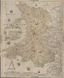 Map making became increasingly common in the reign of Elizabeth I made possible by advances in surveying technology and printing from engraved copper plates. Accurate mapping of the whole country became increasingly important. Lord Burghley was instrumental in ensuring that a court official, Thomas Seckford of Woodbridge, Suffolk, financed the commission.[6] In 1574 Saxton began the survey of England.[7] In consideration of the expenses involved, Queen Elizabeth granted him a lease on lands at Grigstone Manor in Suffolk. The Welsh survey began in 1577.[8] Surveying the country was a significant undertaking but the first plates were engraved by 1574 and in 1578 the survey was complete.[9] As the task was finished in a short timespan it is possible that Saxton used some of John Rudd's earlier work.[6] Individual county sheets were issued before the completed survey was issued as an atlas in 1579. The proofs were presented to Lord Burghley who compiled them into an atlas of his own.[9]