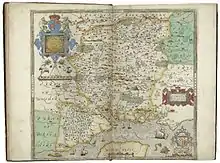 The maps were produced in the Atlas of the Counties of England and Wales published in 1579, the first atlas of any country. It contained 35 maps, each bearing the arms of Elizabeth I and Thomas Seckford, Saxton's patron. The maps show hills and mountains but do not provide precise information as to their location or altitude. A variety of symbols show buildings and settlements.[9] All the maps are dated except for Northumberland. Five counties, Cornwall, Essex, Hertfordshire, The Suffolk and Norfolk maps show the division into hundreds.[10] The atlas was a commercial success, prompting other cartographers including John Speed, John Norton, and Michael Drayton to attempt similar enterprises, adding to and adapting Saxton's work.[11]