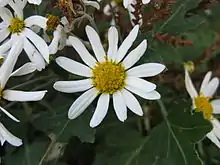 Chrysanthemum japonense (also known as ashizuri noji-giku Ashizuri (Japanese) meaning "Point wild roadside daisy" or gold / silver chrysanthemum in English) is a flowering plant within the genus Chrysanthemum of the family Asteraceae. It has 27 pairs of chromosomes. A perennial flowering plant, it has leaves between 3–5 cm in length and flower heads that are 3–4.5 cm with white petals. Typically, flowering occurs in October to December annually. It the floral emblem of Hyōgo Prefecture.