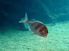 Chrysoblephus anglicus, the Englishman seabream, is a fish that is endemic to South Africa and occurs from Algoa Bay to Mozambique. The fish is silvery with a blue spot on the dorsal scales and 4 red vertical stripes across the body. The fish grows to 90 cm (35 in) in length and then weighs 7 kg (15 lb).