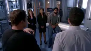 ![]() Chuck and Casey confront the murder suspects: Josie, Director Bentley, Damien, and Lewis. | |