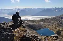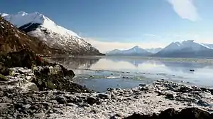 The Lakeside Trail travels 12.7 miles (20.4 kilometers) along the shores of Eklutna Lake until it reaches the mile-long Eklutna Glacier Trail that leads in short order to the moraines at the foot of the colossal blue ice of Eklutna Glacier.[8] In the summer, travelers go on foot, by mountain bike, ATV or on horseback, past the lake by way of largely flat trail to the glacier.[8] A traverse with three huts maintained by the Mountaineering Club of Alaska begins at the end of the trail and heads over the tops of the Eklutna, Whiteout, Eagle and Raven glaciers, and ends 31 miles (50 kilometers) away at Crow Pass near Girdwood on the opposite side of the park.[8] In wintertime, trail users are able to travel the same route by snowmobile (snowmachine), snowshoes or cross-country skis as permitted by regulation and weather conditions.[8] As most of the trail is an old roadbed, the trail is a popular winter destination for skijoring and dogsledding.[9] There are two remote campgrounds in the area in addition to a frontcountry campground open during the summer.[8] Two public use cabins are available for rent on the Lakeside Trail.[8] Non-motorized boats, and boats with an electric motor, are allowed on Eklutna Lake.[8] The tallest point in the park, Bashful Peak, towers over the lake at a height of 8,005 feet (2,440 meters).[10] Bush planes are able to land on the far (southern) side of Eklutna Lake at the unpaved Bold Airstrip.[11] North of Eklutna, the southern summit of Pioneer Peak can be reached from Knik River Road via the Pioneer Ridge Trail beginning outside the park boundaries in the Matanuska-Susitna Borough.[12][13]