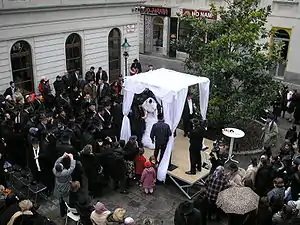 A traditional chuppah, especially in Orthodox Judaism, recommends that there be open sky exactly above the chuppah,[3] although this is not mandatory among Sephardic communities. If the wedding ceremony is held indoors in a hall, sometimes a special opening is built to be opened during the ceremony. Many Hasidim prefer to conduct the entire ceremony outdoors. It is said that the couple's ancestors are present at the chuppah ceremony.[4]