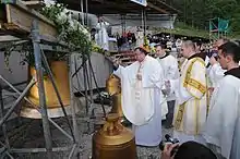A church bell in Christian architecture is a bell which is rung in a church for a variety of religious purposes, and can be heard outside the building. Traditionally they are used to call worshippers to the church for a communal service, and to announce the fixed times of daily Christian prayer, called the canonical hours, which number seven and are contained in breviaries. They are also rung on special occasions such as a wedding, or a funeral service. In some religious traditions they are used within the liturgy of the church service to signify to people that a particular part of the service has been reached.[1] The ringing of church bells, in the Christian tradition, is also believed to drive out demons.[2][3][4]