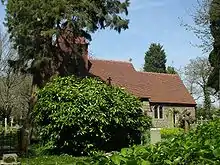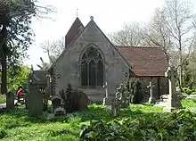 Church in the Wood's parish was reduced in size in 1870 when some of its territory was given to the newly built St John the Evangelist's Church. Hollington became part of the Borough of Hastings in 1897.[19] After this, little change occurred in the church itself, although a lychgate was built at the entrance to the churchyard in 1937,[20] general repairs were made in 1964 and an extension was added in 1977 to form a parish room and vestry.[16][21] The churchyard is large and has been used for centuries—the first recorded burial took place in 1606, and the oldest surviving gravestone dates from 1678—and it is the last remaining private burial ground in the Borough of Hastings.[16]