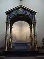 In the 1960s, it was once more decided that the rebuilding of the church should go ahead and Robert Potter was selected as the architect.[2] He reorientated the church so that the altar now faces East.[1] The altar itself is free standing and is set under a ciborium, a four-columned indoor roof.[1][2] Behind the font is a series of stained glass windows made from fibre glass and designed by John Piper.[1][2] The new nave and altar were consecrated on 1 July 1967.[2]