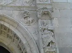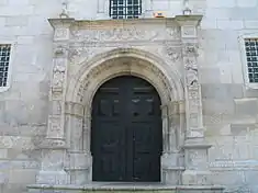 The four-story, central body includes a portico and entablature with jamb supporting a large window, crowned by tympanum by João de Ruão.[1][2] In Roman arch portico with square soffits, is decorated with rosettas and stars, delimited by pilasters and an entablature.[1] The arch stands on a frame consisting of decorated pilasters and small columnar balustrades.[2] Over the archivolts are decorated astragali, while flanking the door are pilasters divided by cornices with niches that contain the relief images of Saint Peter and Saint Paul (on either side), surmounted by urns.[1][2] In bass relief are two profiles: on the left, a male figure, and on the right a female figure.[1][2] The entablature, with sculpted frieze, has the coat-of-arms of the Cantanhede family, while the on either extreme ends of the architrave are two decorative spires.[1][2]